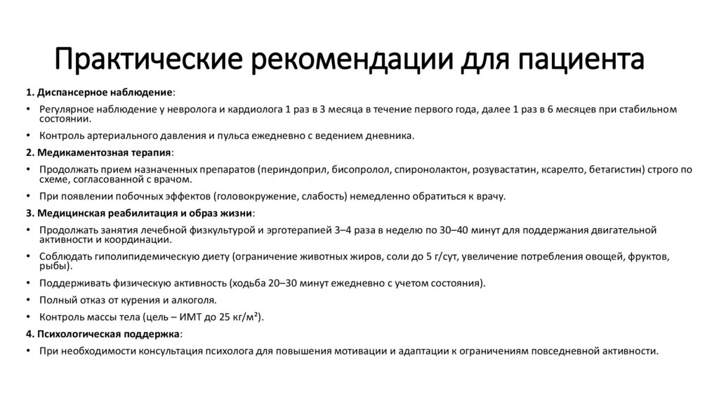 1. Диспансерное наблюдение:• Регулярное наблюдение у невролога и кардиолога 1 раз в 3 месяца в течение первого года, далее 1 раз в 6 месяцев при стабильном