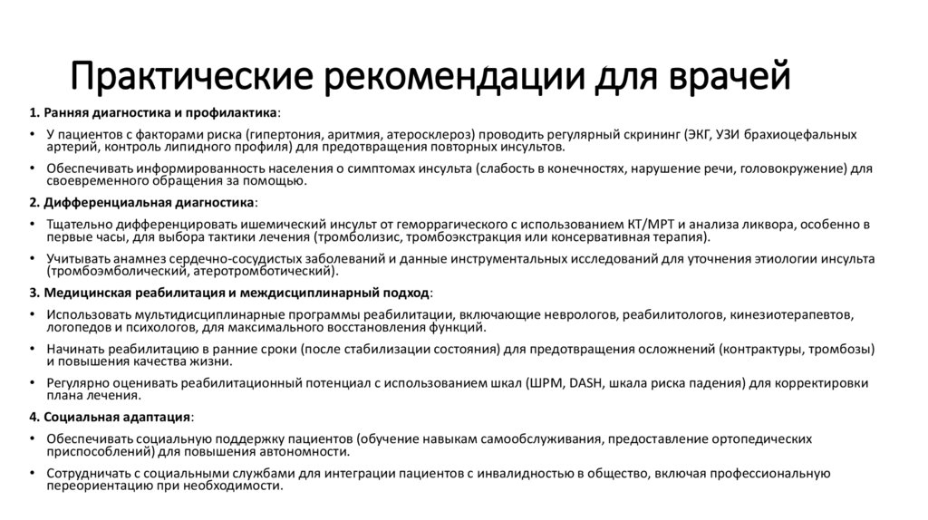 1. Ранняя диагностика и профилактика:• У пациентов с факторами риска (гипертония, аритмия, атеросклероз) проводить регулярный скрининг (ЭКГ, УЗИ брахиоцефальных