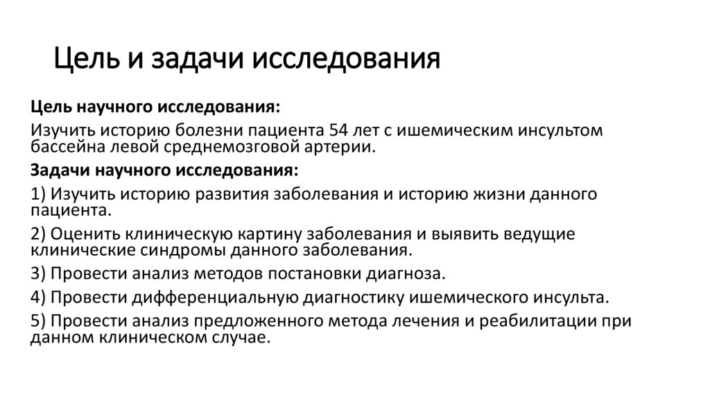 Цель научного исследования:Изучить историю болезни пациента 54 лет с ишемическим инсультом