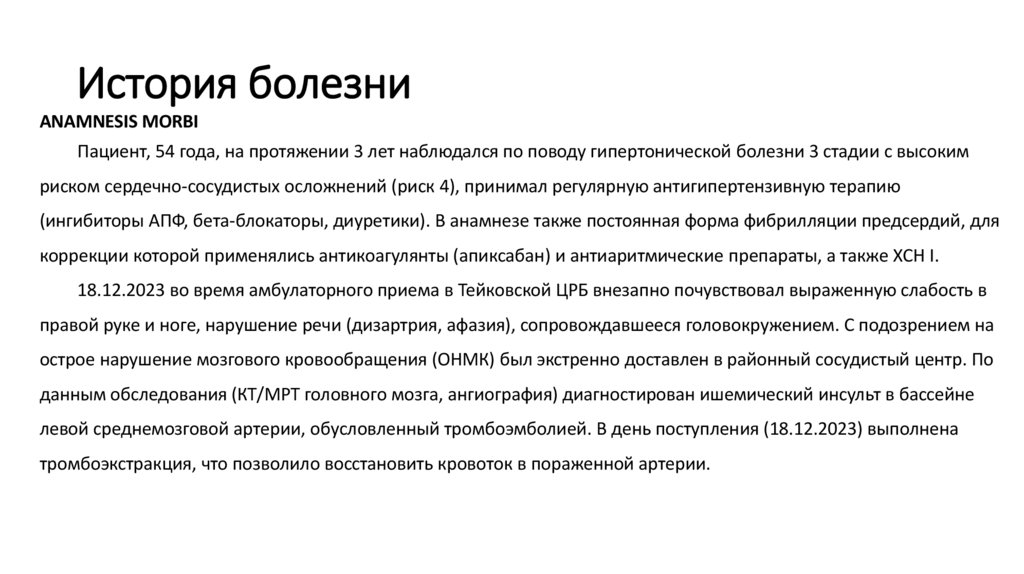 левой среднемозговой артерии, обусловленный тромбоэмболией. В день поступления (18.12.2023) выполнена
