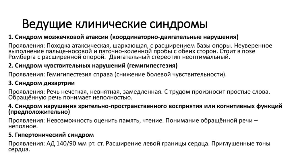 1. Синдром мозжечковой атаксии (координаторно-двигательные нарушения)Проявления: Походка атаксическая, шаркающая, с расширением базы опоры. Неуверенное