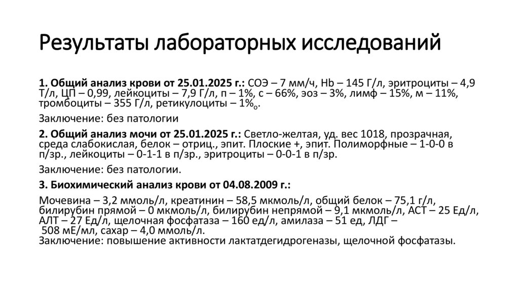 1. Общий анализ крови от 25.01.2025 г.: СОЭ – 7 мм/ч, Hb – 145 Г/л, эритроциты – 4,9Т/л, ЦП – 0,99, лейкоциты – 7,9 Г/л, п – 1%, с – 66%, эоз – 3%, лимф – 15%, м – 11%,