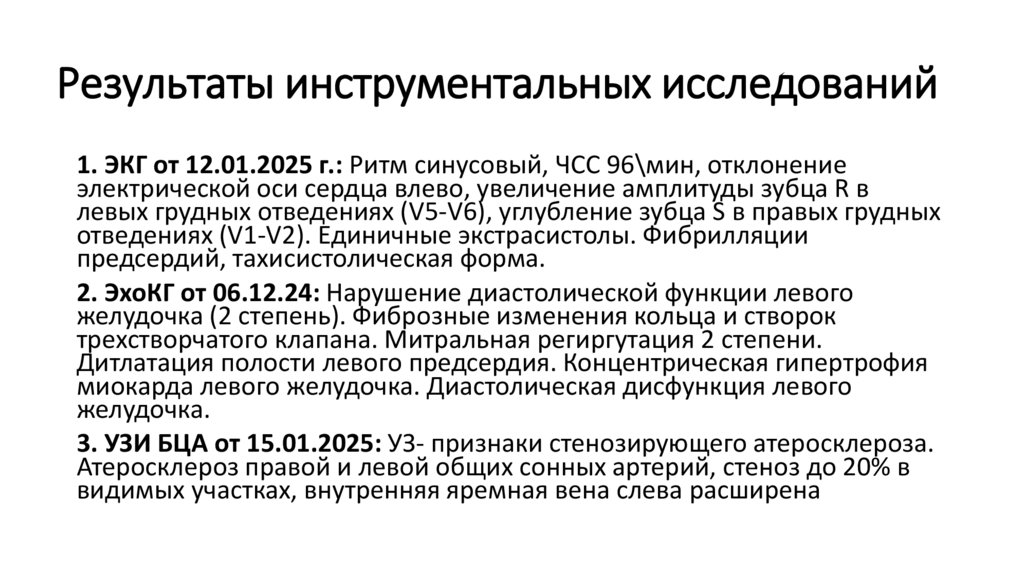 • Дополнительно использовались ЭКГ (выявлена фибрилляция предсердий, гипертрофия левого желудочка).