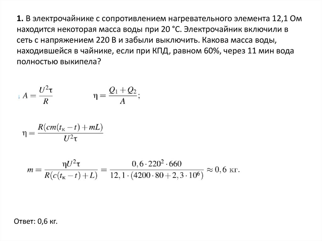 1. В электрочайнике с сопротивлением нагревательного элемента 12,1 Омнаходится некоторая масса воды при 20 °С. Электрочайник включили в