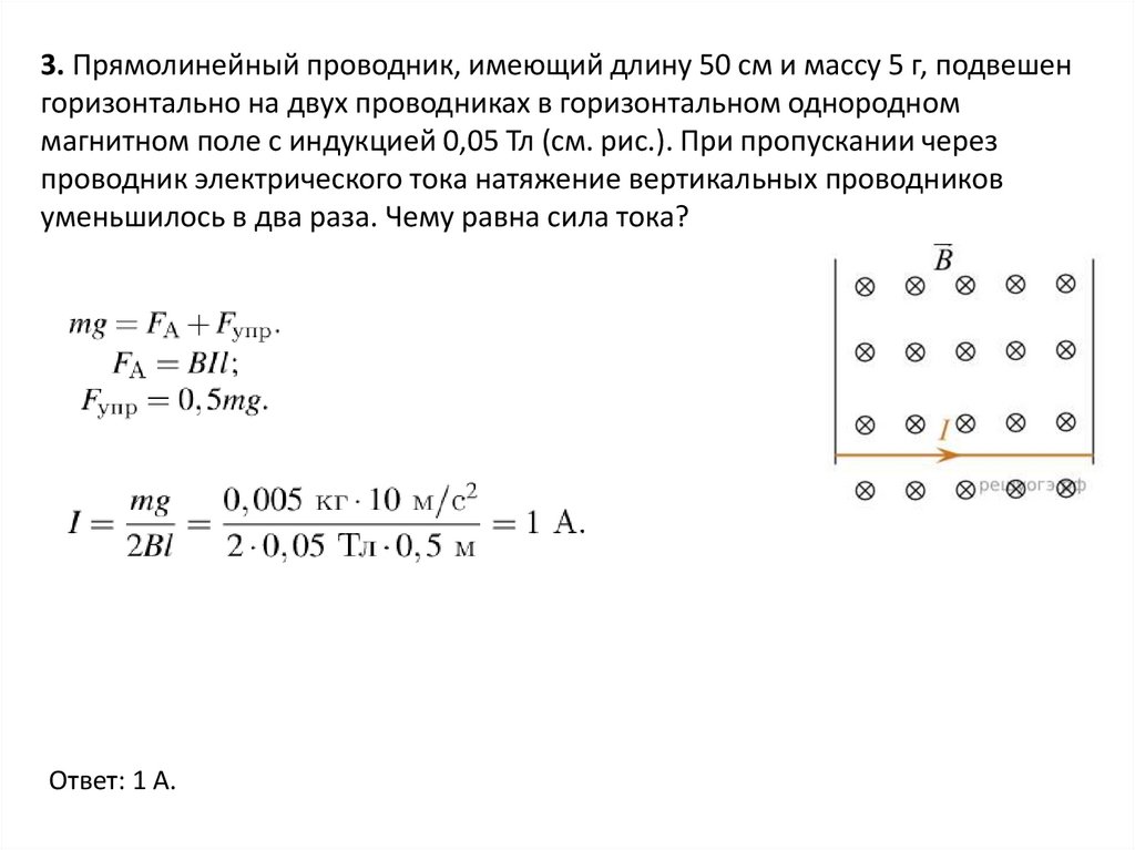 3. Прямолинейный проводник, имеющий длину 50 см и массу 5 г, подвешенгоризонтально на двух проводниках в горизонтальном однородном