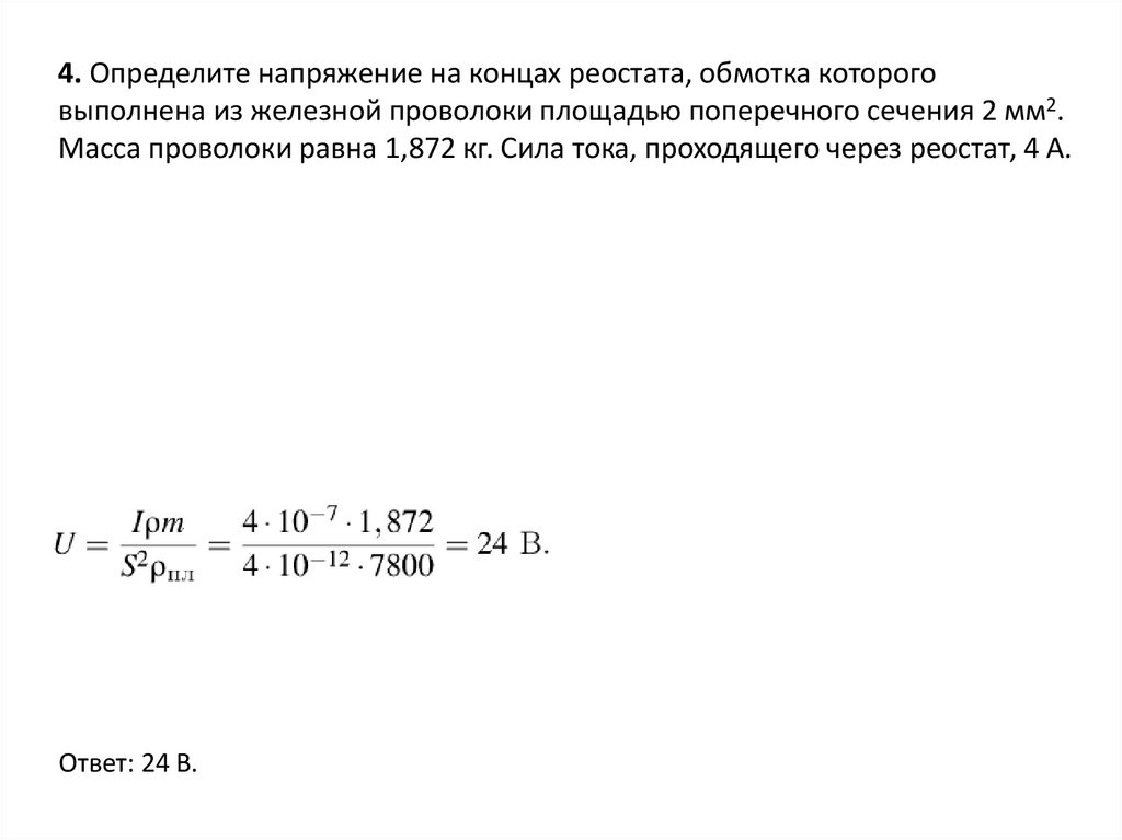 4. Определите напряжение на концах реостата, обмотка котороговыполнена из железной проволоки площадью поперечного сечения 2 мм2.