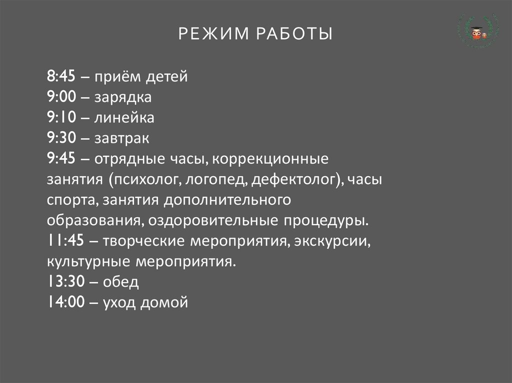 РЕЖИМ РАБОТЫ8:45 – приём детей