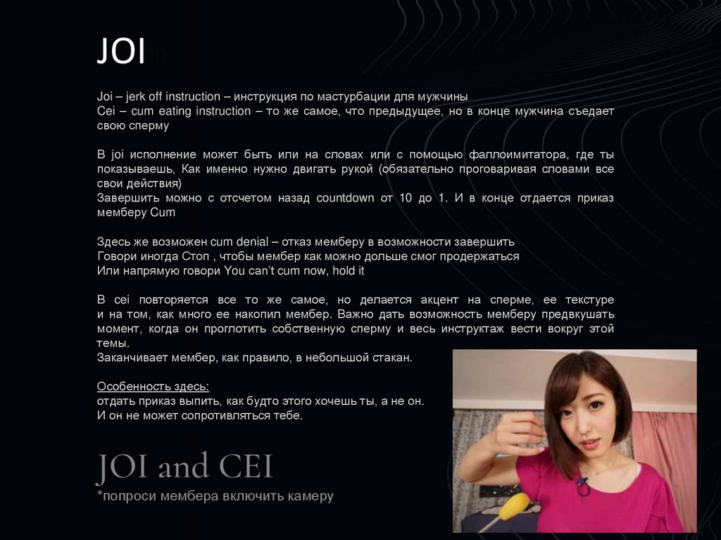 В joi исполнение может быть или на словах или с помощью фаллоимитатора, где ты