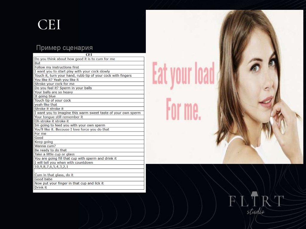 Cei – cum eating instruction – то же самое, что предыдущее, но в конце мужчина съедает