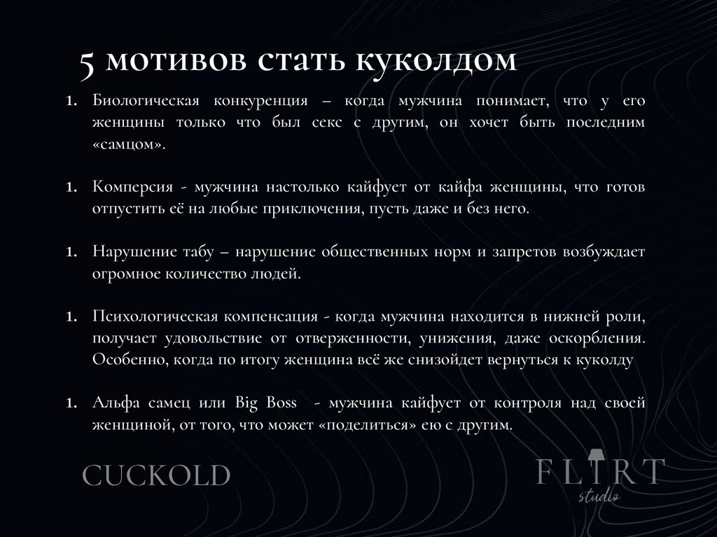 5 мотивов стать куколдом1. Биологическая конкуренция – когда мужчина понимает, что у его