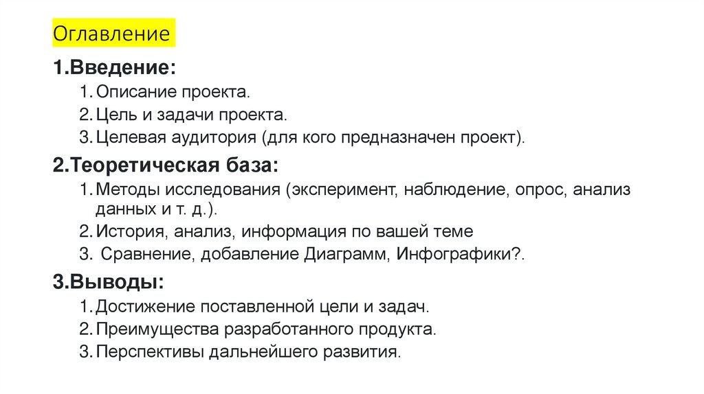 • Начать разрабатывать презентацию (темы в оглавлении