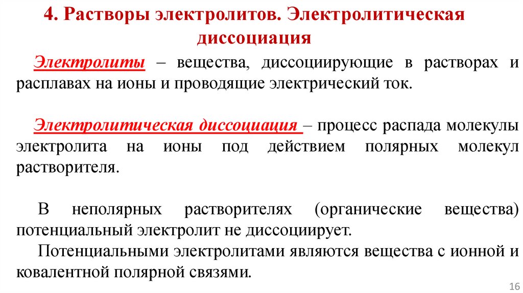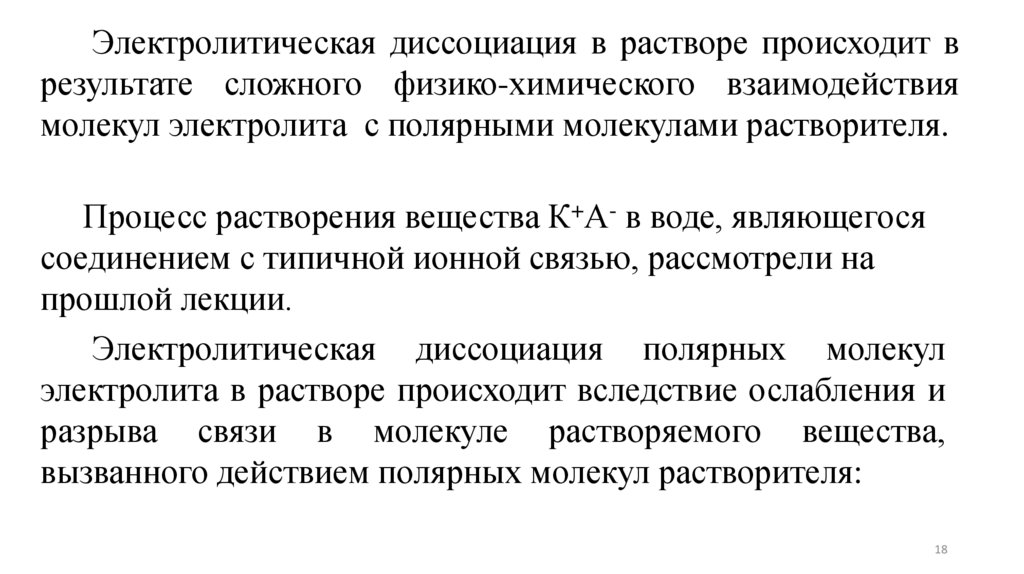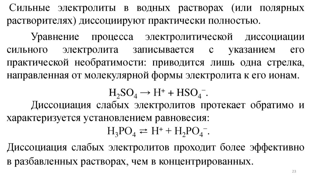 Сильные электролиты в водных растворах (или полярныхрастворителях) диссоциируют практически полностью.