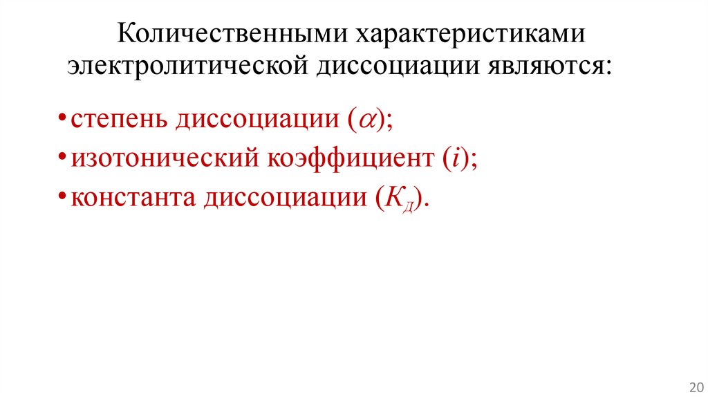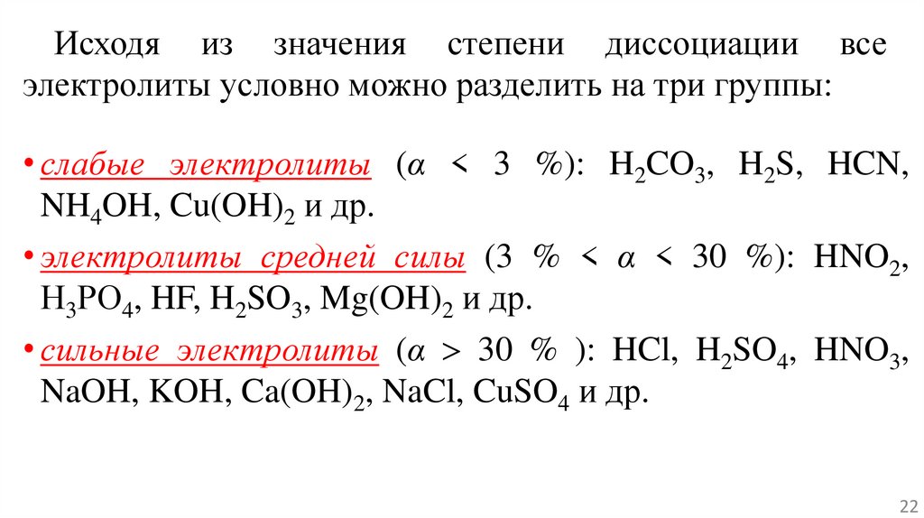 22. Исходя из значения степени диссоциации все электролиты условно можно разделить на три группы: