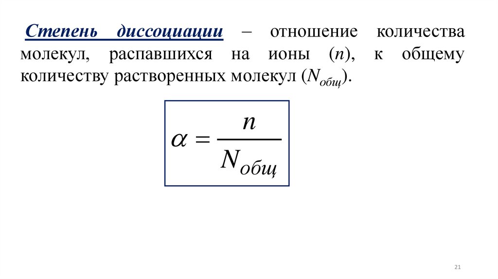 Степень диссоциации – отношение количествамолекул, распавшихся на ионы (n), к общему