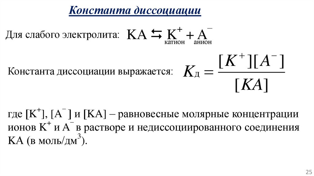 где [K ], [A ] и [KA] – равновесные молярные концентрации