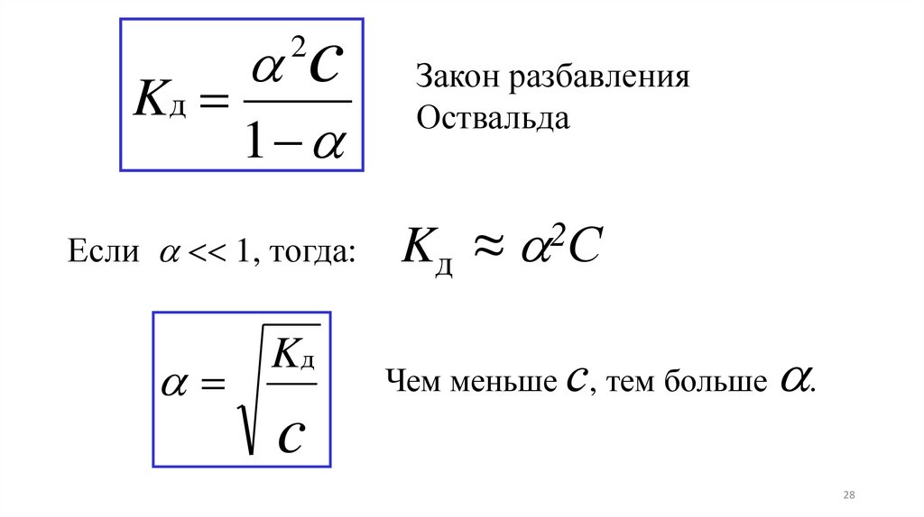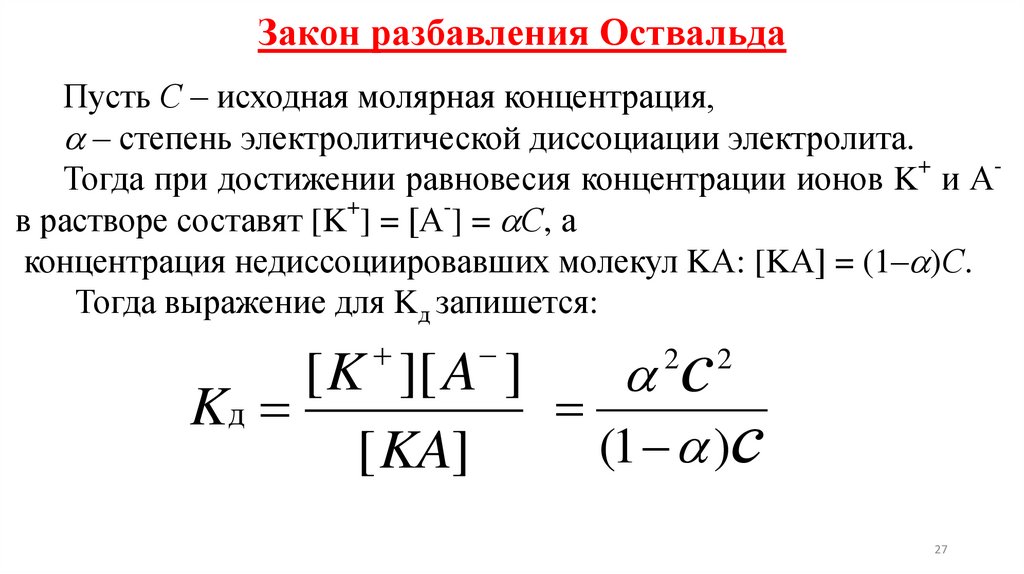 Закон разбавления ОствальдаПусть С – исходная молярная концентрация,