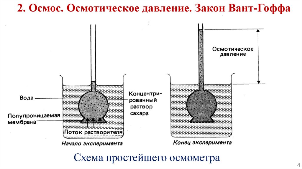 2. Осмос. Осмотическое давление. Закон Вант-ГоффаСхема простейшего осмометра