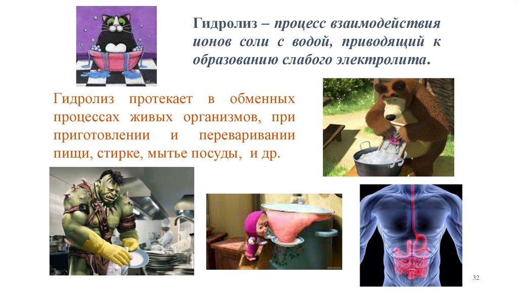 Гидролиз – процесс взаимодействияионов соли с водой, приводящий к