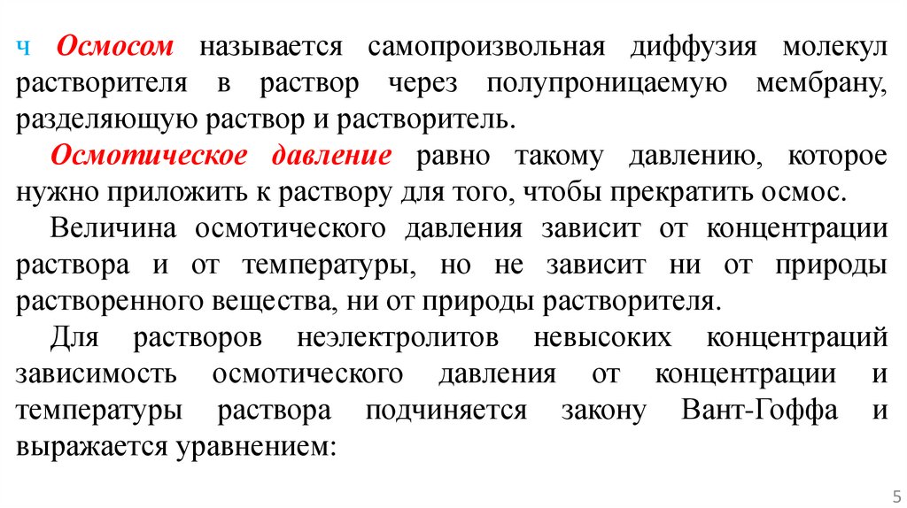 ч Осмосом называется самопроизвольная диффузия молекулрастворителя в раствор через полупроницаемую мембрану,
