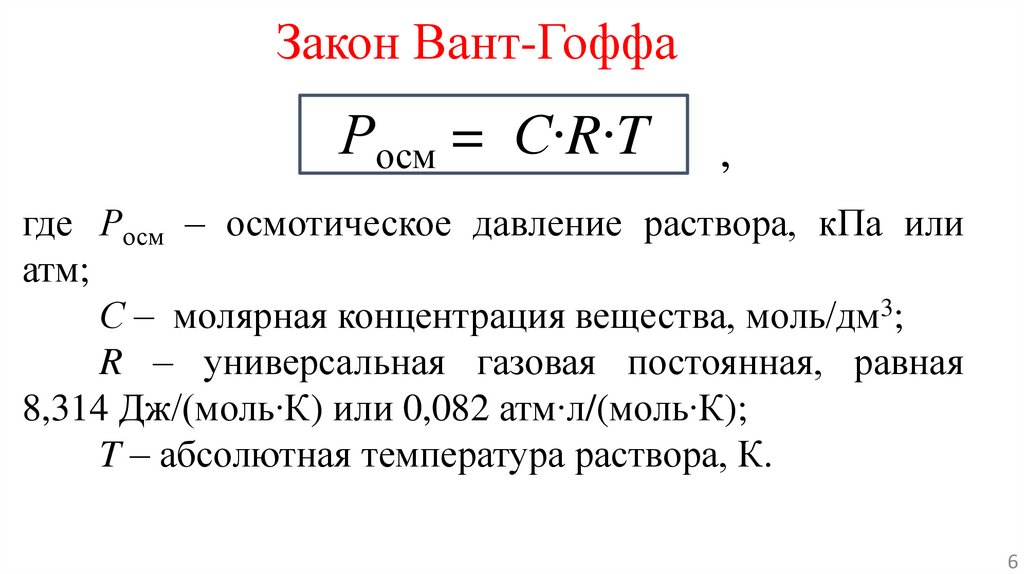 Закон Вант-Гоффа для разбавленных растворов электролитов:Pосм = i∙СRT