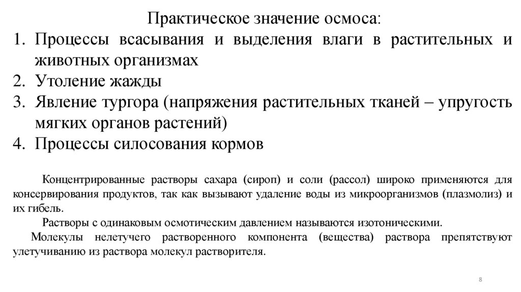 Практическое значение осмоса:1. Процессы всасывания и выделения влаги в растительных и