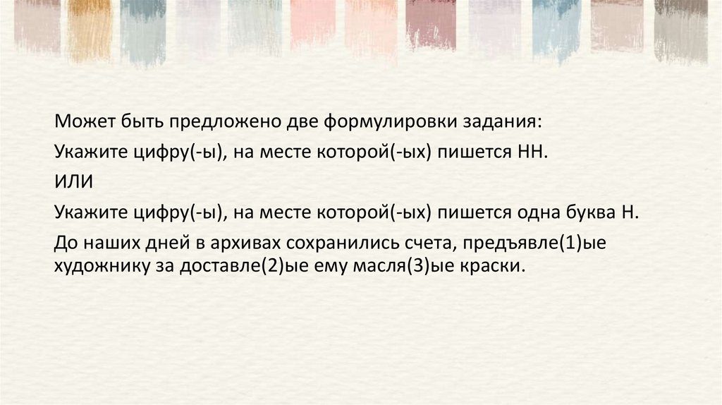 Может быть предложено две формулировки задания:Укажите цифру(-ы), на месте которой(-ых) пишется НН.