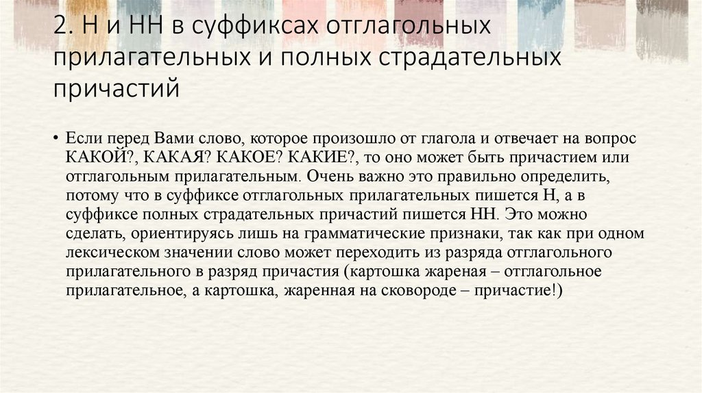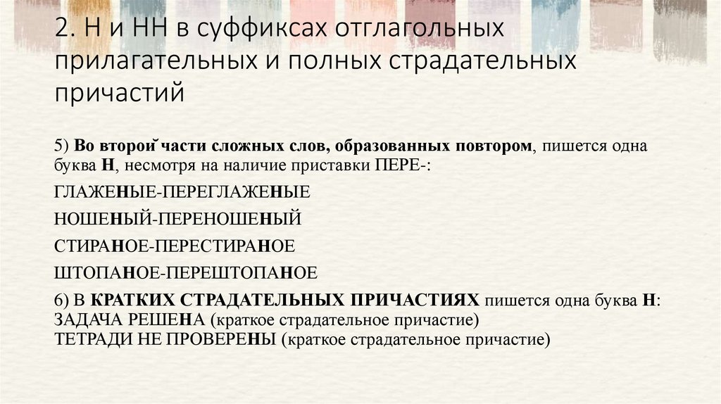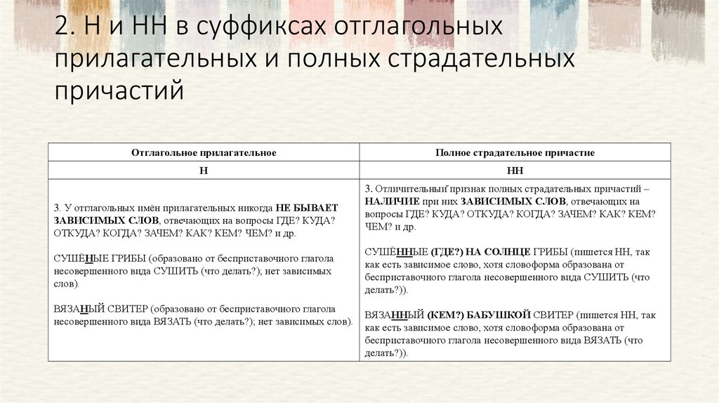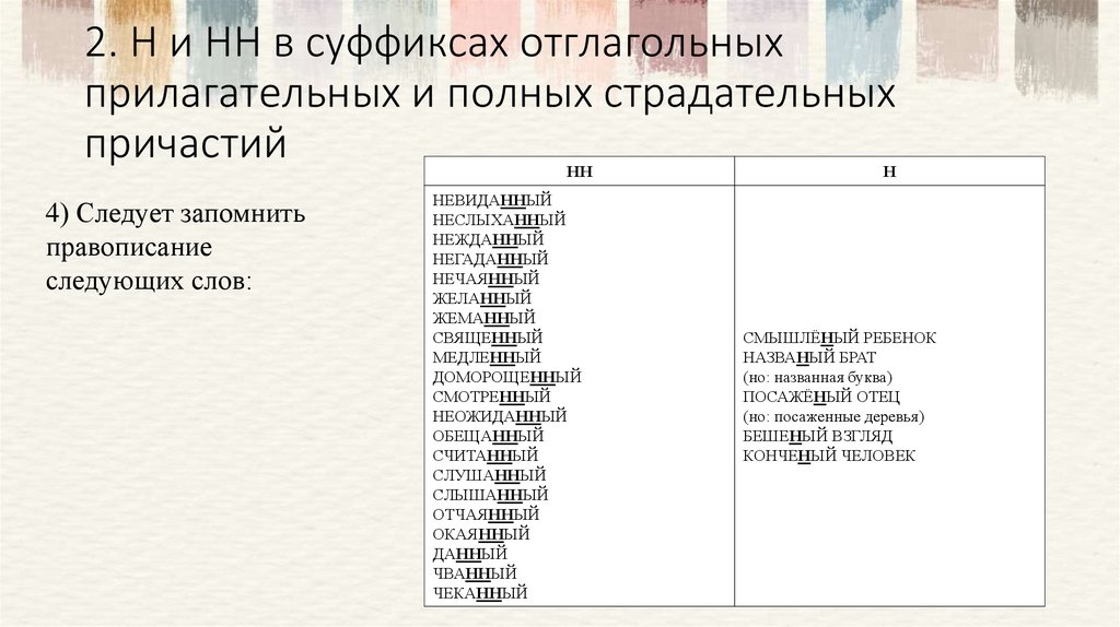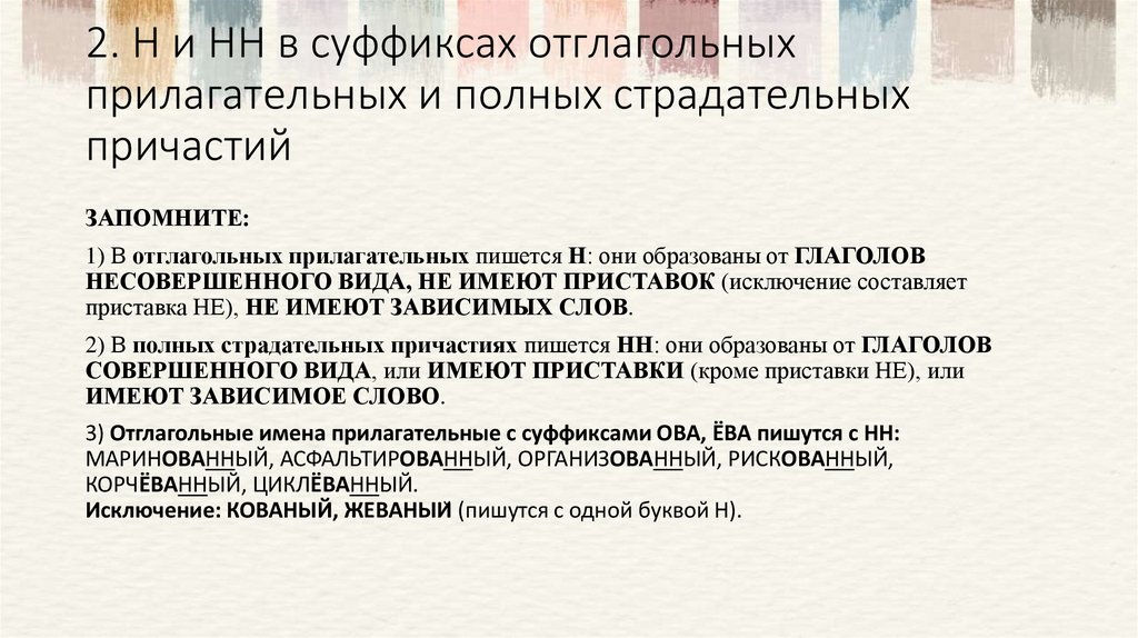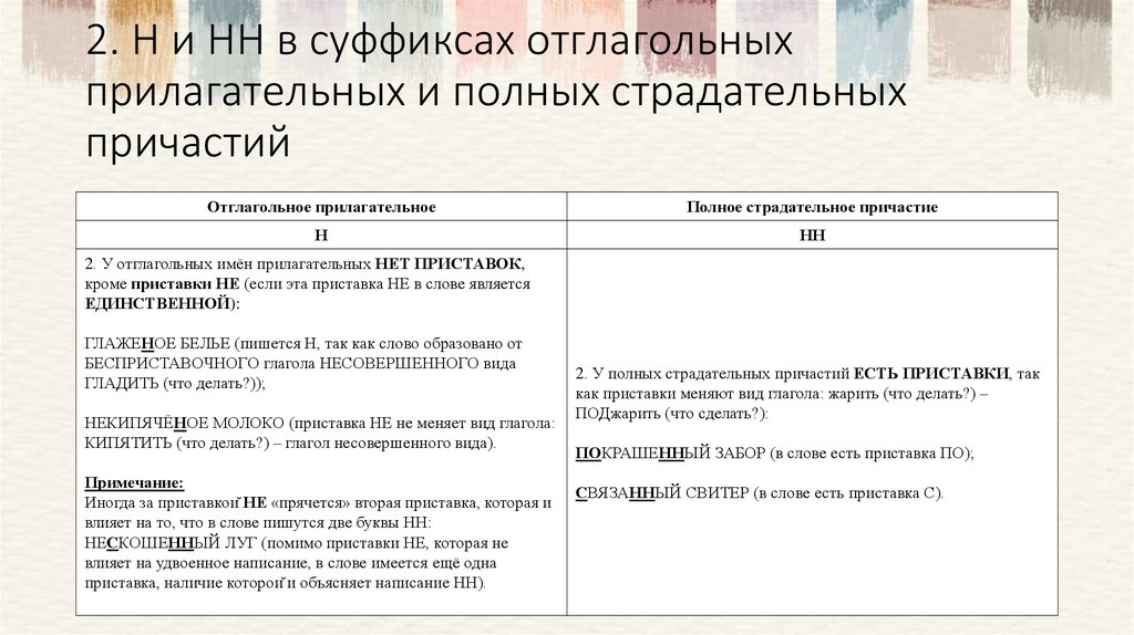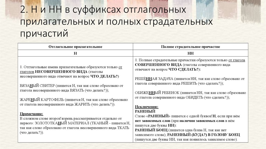 12. 2. Н и НН в суффиксах отглагольных прилагательных и полных страдательных причастий
