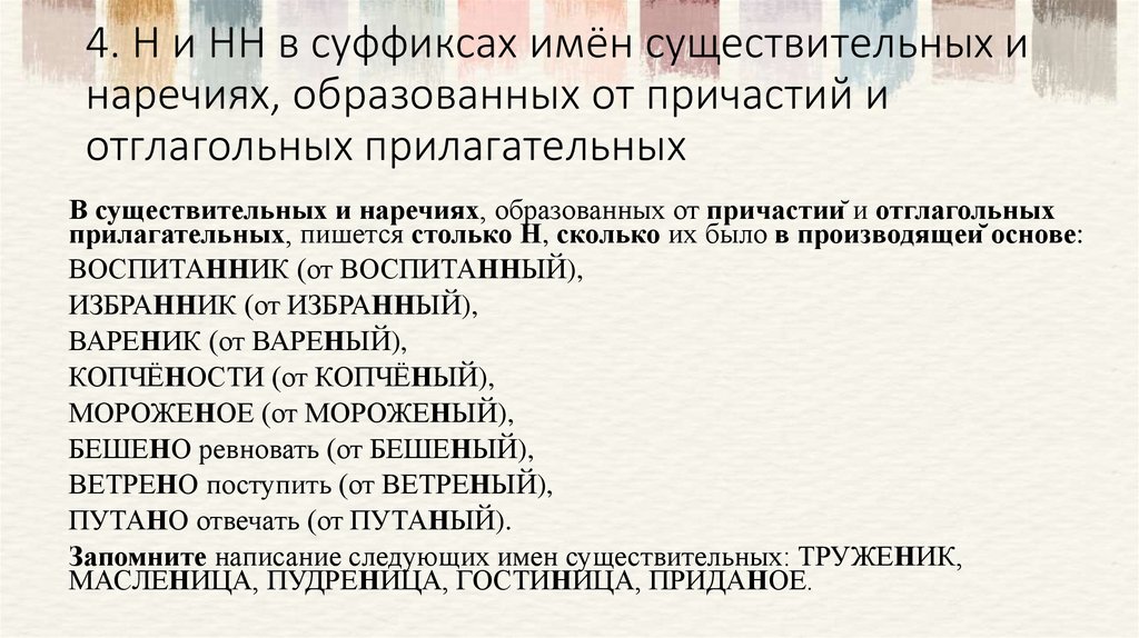 14. 4. Н и НН в суффиксах имён существительных и наречиях, образованных от причастий и отглагольных прилагательных