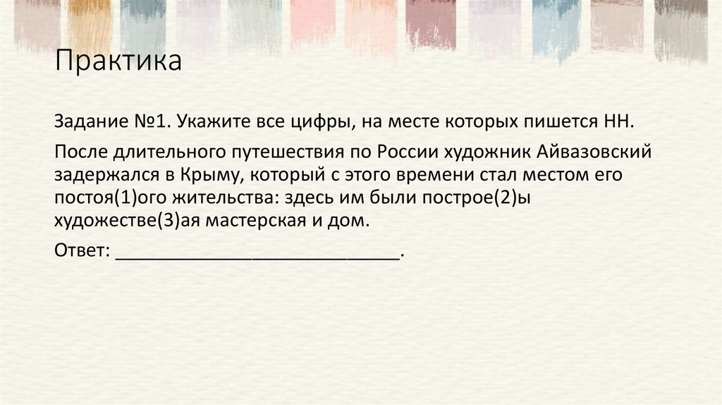 Задание №1. Укажите все цифры, на месте которых пишется НН.После длительного путешествия по России художник Айвазовский