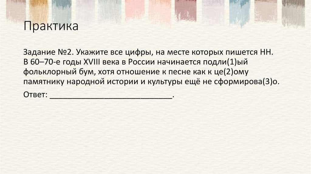 Задание №2. Укажите все цифры, на месте которых пишется НН.В 60–70-е годы XVIII века в России начинается подли(1)ый