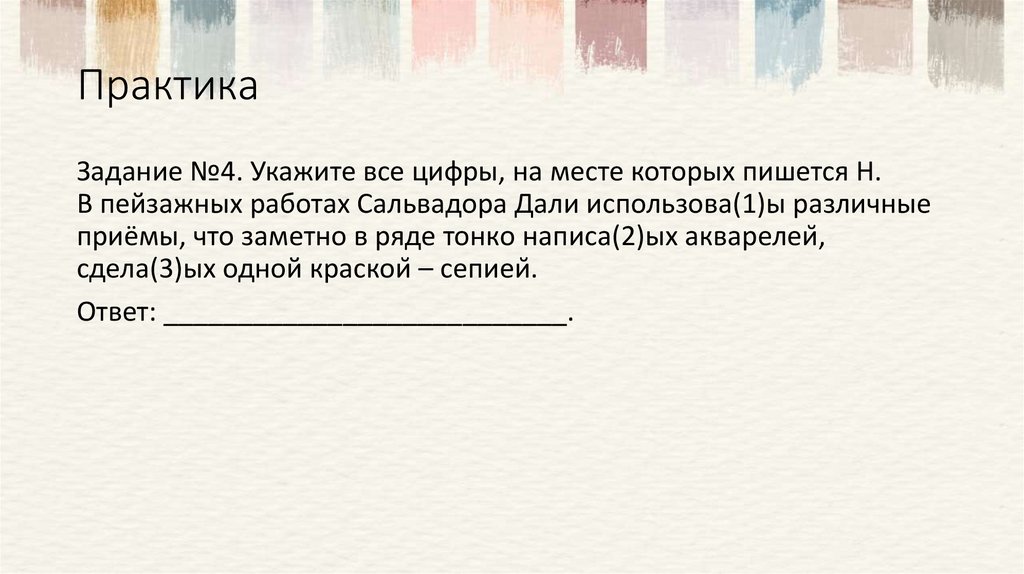 Задание №4. Укажите все цифры, на месте которых пишется Н.В пейзажных работах Сальвадора Дали использова(1)ы различные