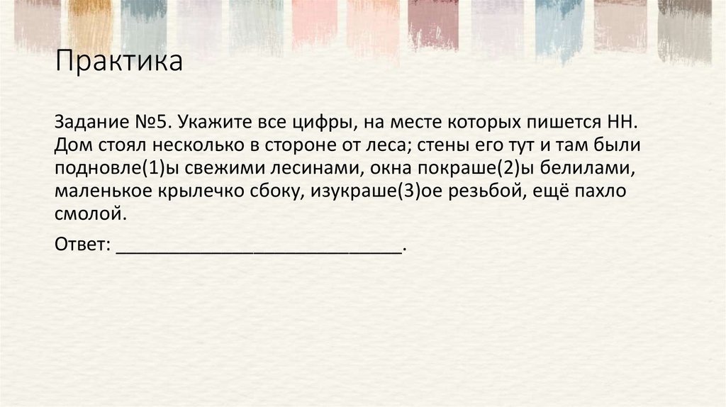 Задание №5. Укажите все цифры, на месте которых пишется НН.Дом стоял несколько в стороне от леса; стены его тут и там были