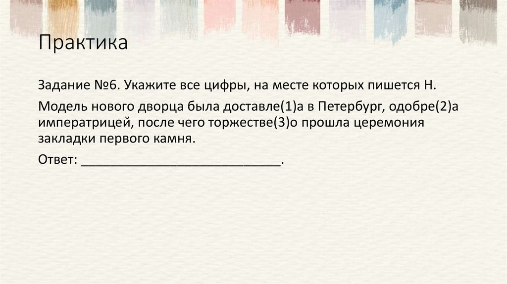 Задание №6. Укажите все цифры, на месте которых пишется Н.Модель нового дворца была доставле(1)а в Петербург, одобре(2)а