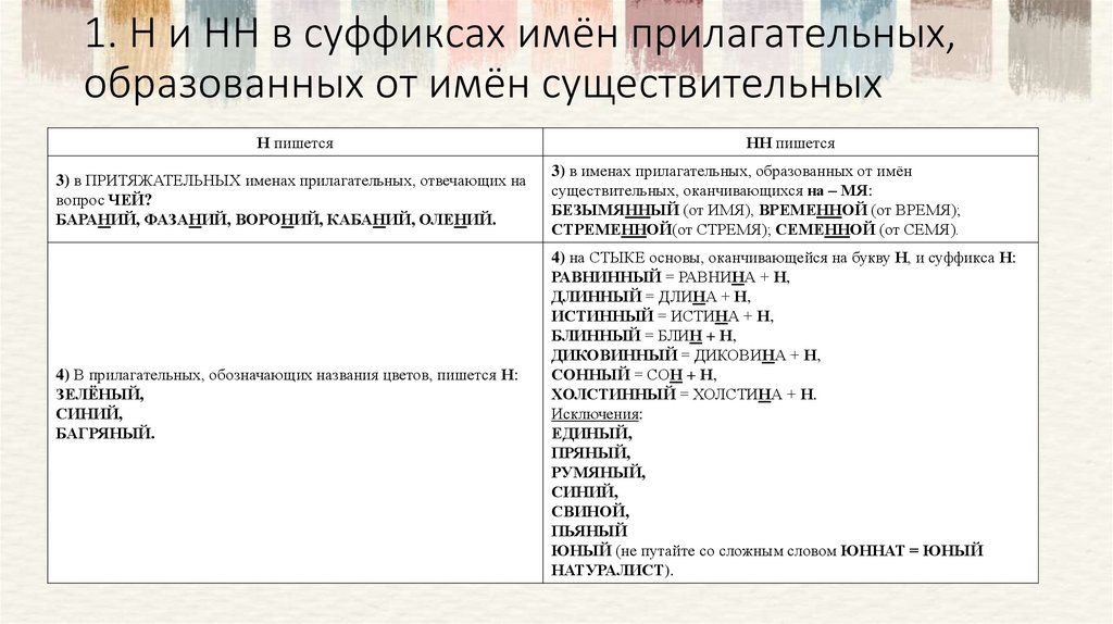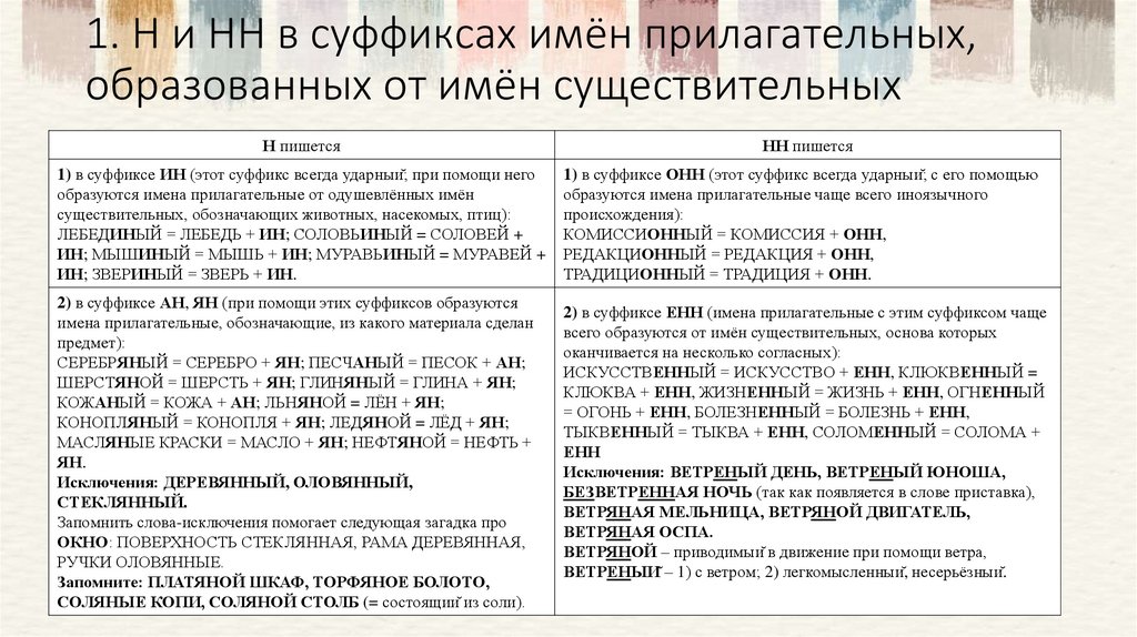 3. 1. Н и НН в суффиксах имён прилагательных, образованных от имён существительных