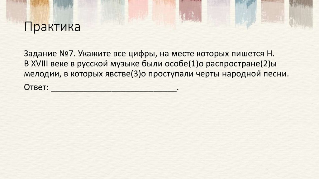 Задание №7. Укажите все цифры, на месте которых пишется Н.В XVIII веке в русской музыке были особе(1)о распростране(2)ы