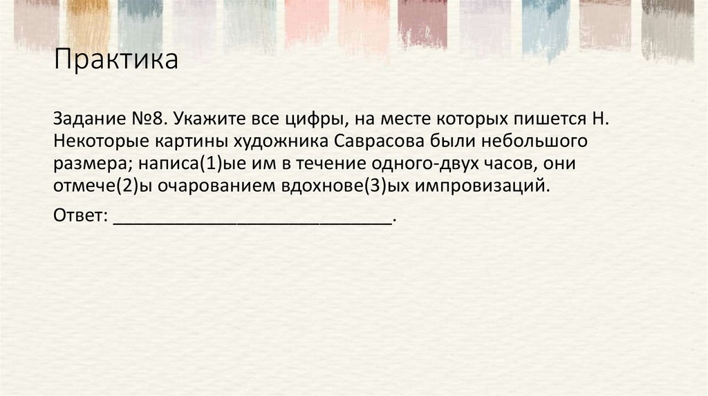 Задание №8. Укажите все цифры, на месте которых пишется Н.Некоторые картины художника Саврасова были небольшого