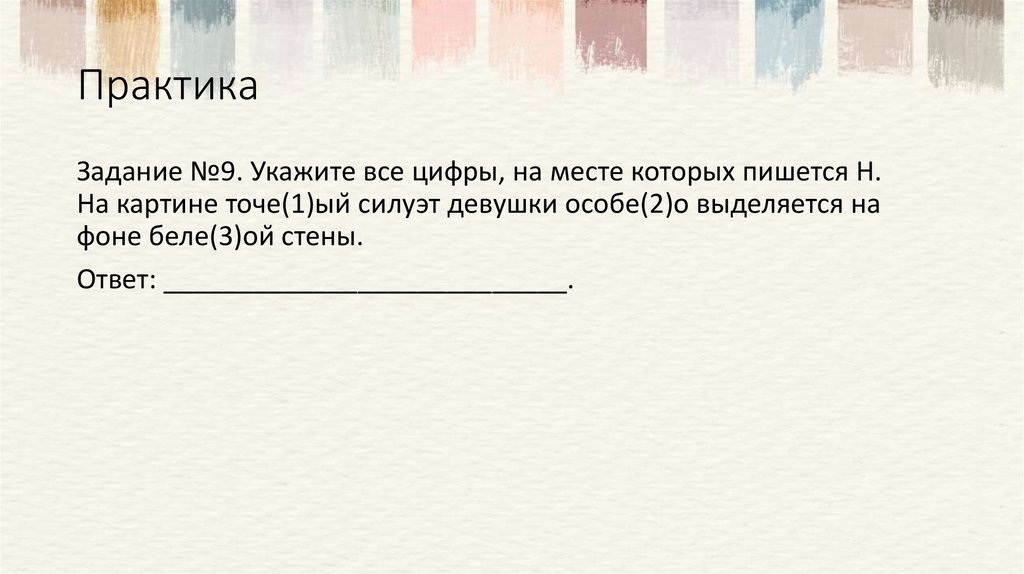 Задание №9. Укажите все цифры, на месте которых пишется Н.На картине точе(1)ый силуэт девушки особе(2)о выделяется на