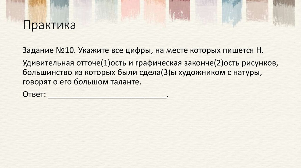 Задание №10. Укажите все цифры, на месте которых пишется Н.Удивительная отточе(1)ость и графическая законче(2)ость рисунков,