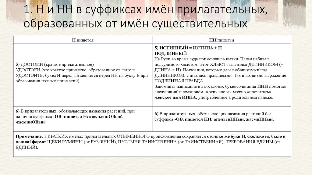 5. 1. Н и НН в суффиксах имён прилагательных, образованных от имён существительных