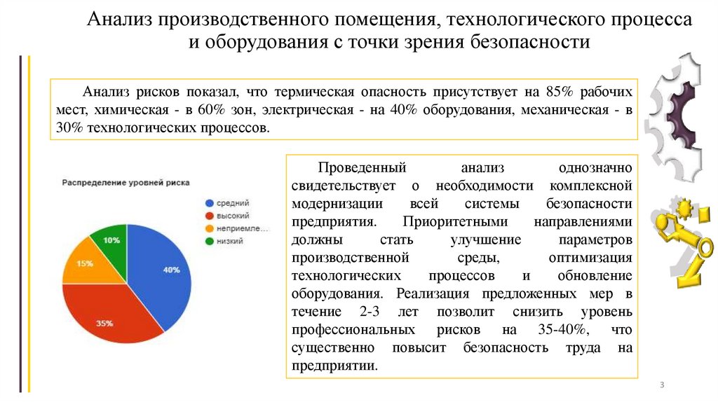 Анализ рисков показал, что термическая опасность присутствует на 85% рабочихмест, химическая - в 60% зон, электрическая - на 40% оборудования, механическая - в