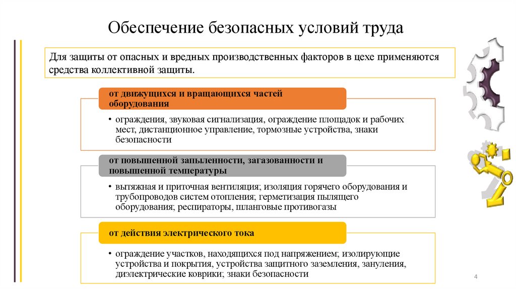 Обеспечение безопасных условий трудаДля защиты от опасных и вредных производственных факторов в цехе применяются