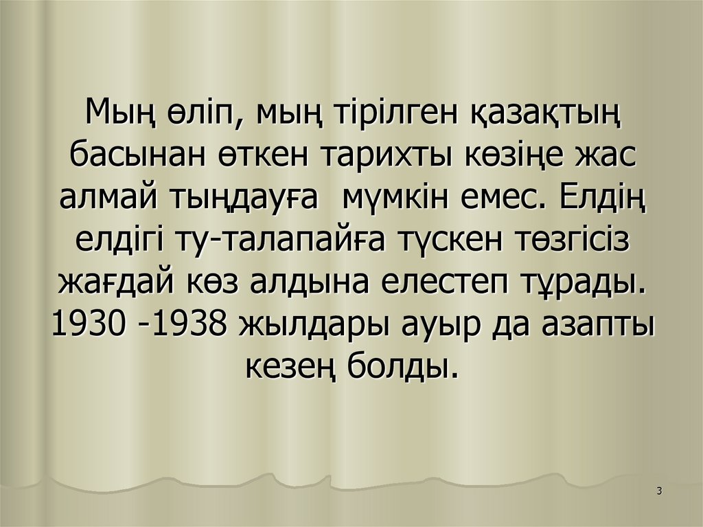 3. Мың өліп, мың тірілген қазақтың басынан өткен тарихты көзіңе жас алмай тыңдауға мүмкін емес. Елдің елдігі ту-талапайға түскен