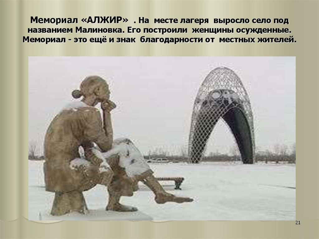 2021. Мемориал «АЛЖИР» . На месте лагеря выросло село под названием Малиновка. Его построили женщины осужденные. Мемориал - это ещё и