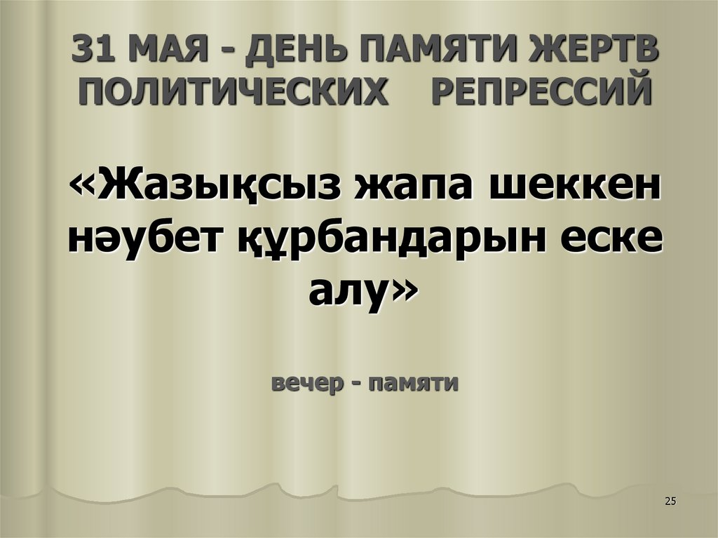 1. 31 МАЯ- ДЕНЬ ПАМЯТИ ЖЕРТВ ПОЛИТИЧЕСКИХ РЕПРЕССИЙ «Жазықсыз жапа шеккен нәубет құрбандарын еске алу» вечер - памяти
