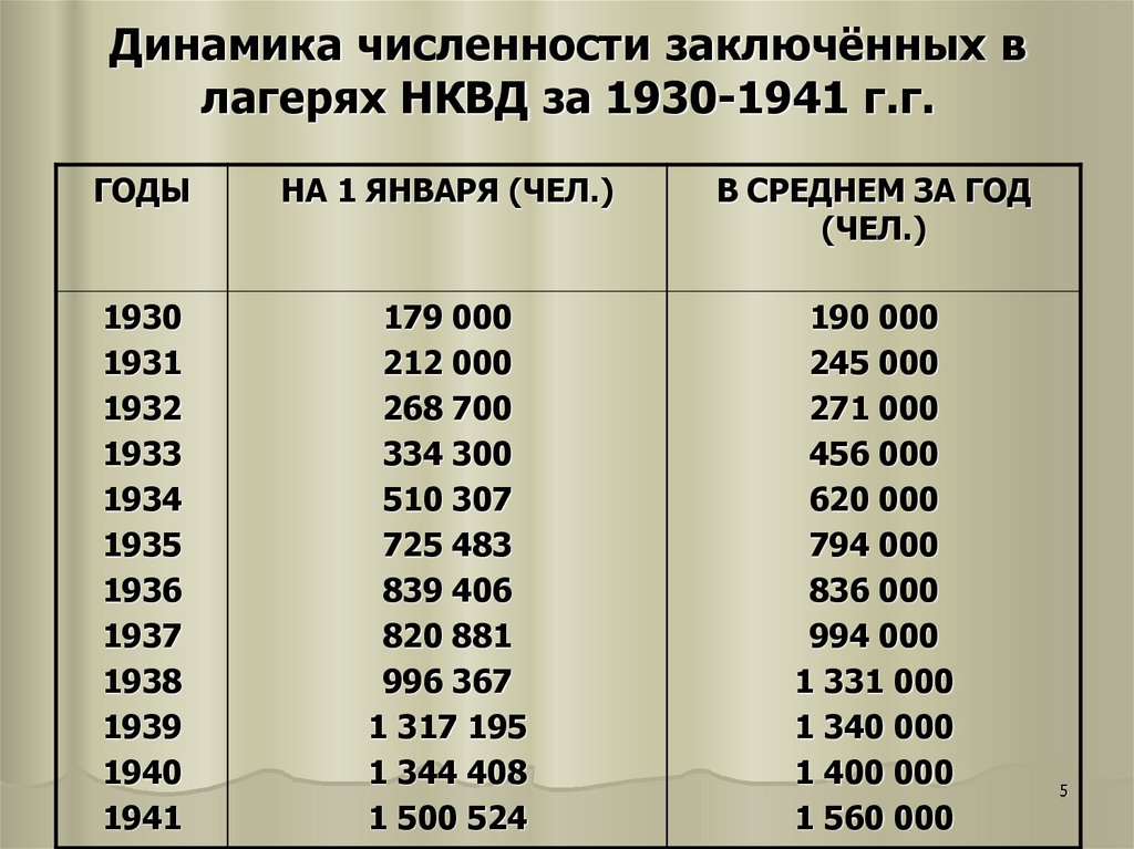 5. Динамика численности заключённых в лагерях НКВД за 1930-1941 г.г.