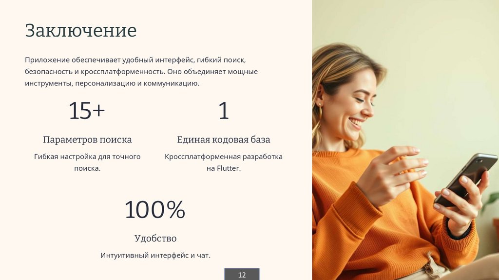 ЗаключениеПриложение обеспечивает удобный интерфейс, гибкий поиск,