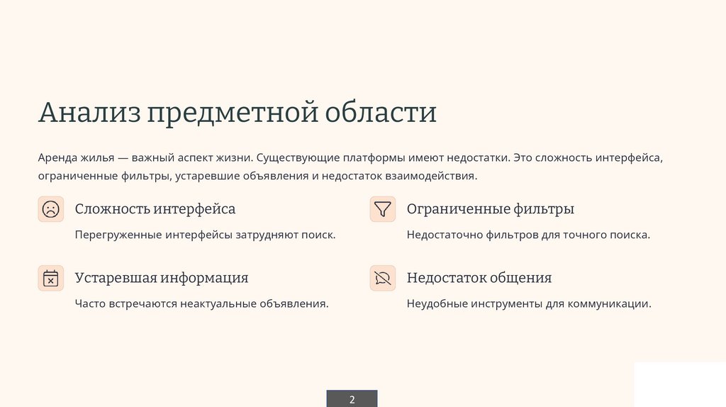 Анализ предметной областиАренда жилья — важный аспект жизни. Существующие платформы имеют недостатки. Это сложность интерфейса,