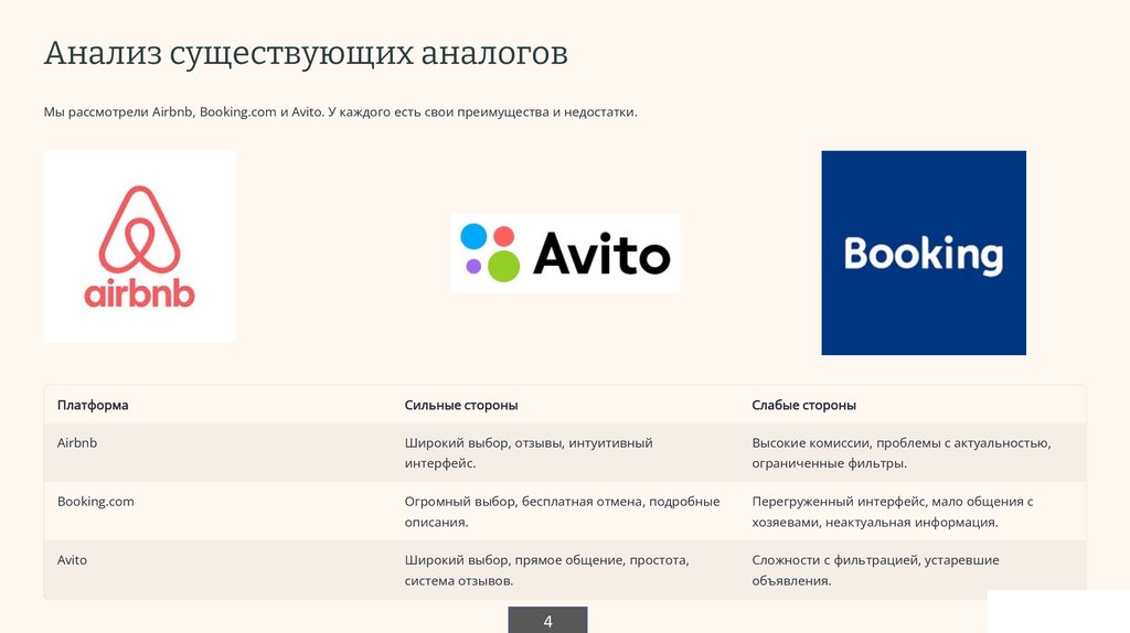 Анализ существующих аналоговМы рассмотрели Airbnb, Booking.com и Avito. У каждого есть свои преимущества и недостатки.
