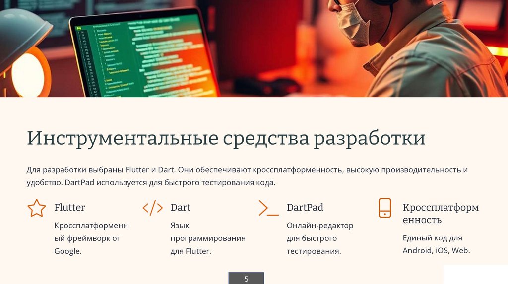 Инструментальные средства разработкиДля разработки выбраны Flutter и Dart. Они обеспечивают кроссплатформенность, высокую производительность и