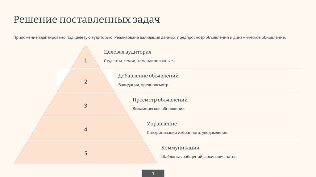 Решение поставленных задачПриложение адаптировано под целевую аудиторию. Реализована валидация данных, предпросмотр объявлений и динамическое обновление.